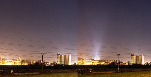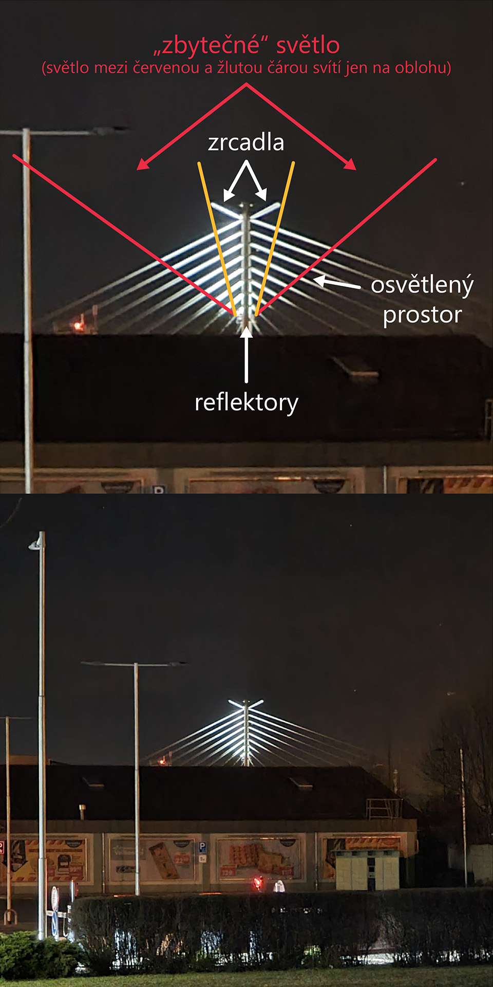 Bohužel reflektory postrádaly jakékoliv stínění, takže většina světla svítila pouze na oblohu.