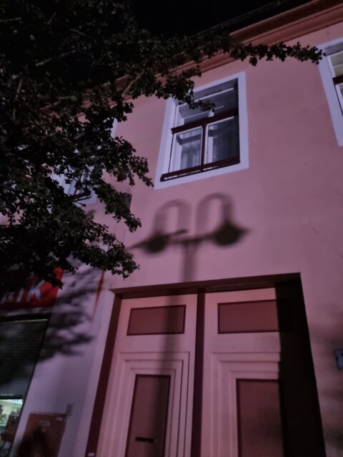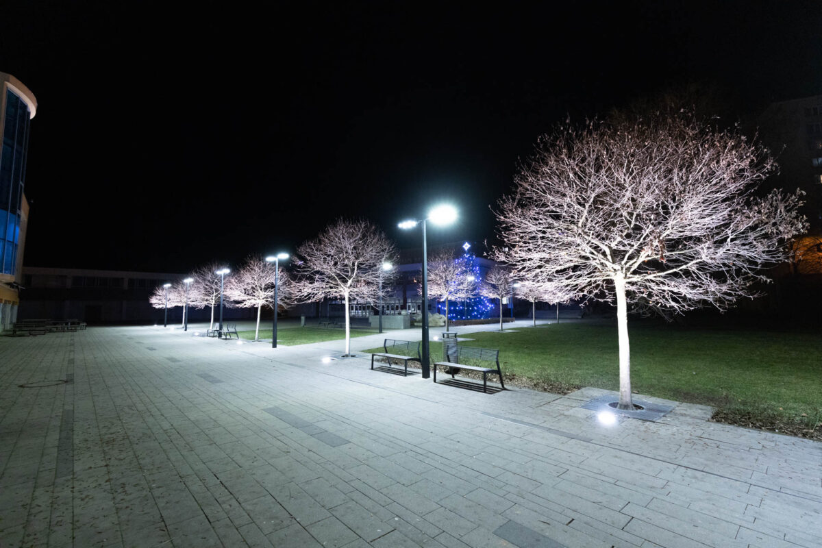 Na náměstí 1. máje jsou stromy osvětleny po celou noc, navíc velmi silnými reflektory z chodníku, které svítí na oblohu.